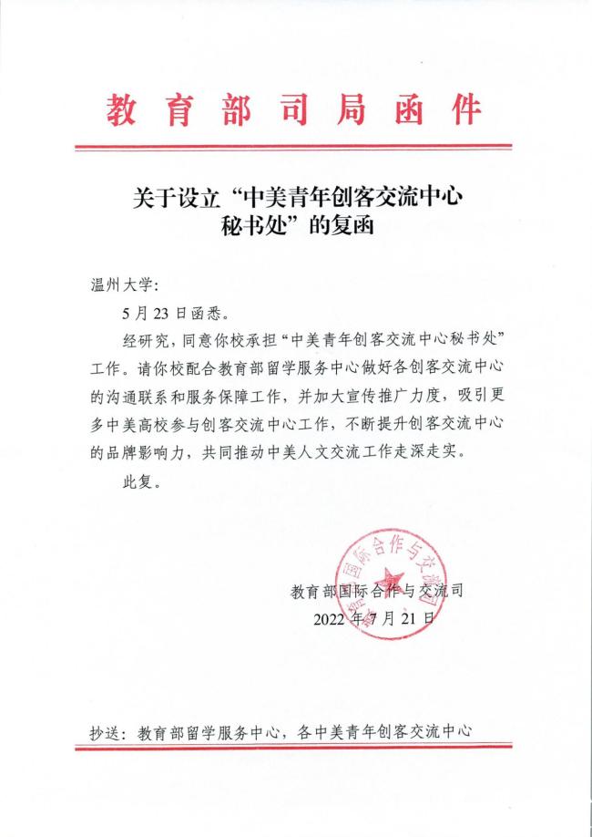 香蕉视频 于2019年7月获批成立中美青年创客交流中心,并于同年12月成功举办中美青年创客交流中心建设研讨会。2020年,香蕉视频 创业教育方向硕士留学生项目获评为优秀工作案例奖;2021年,香蕉视频 中美青年创客交流中心获创新赋能示范奖。2022年7月,教育部国际合作与交流司复函温大,同意在学校设立中美青年创客交流中心秘书处。