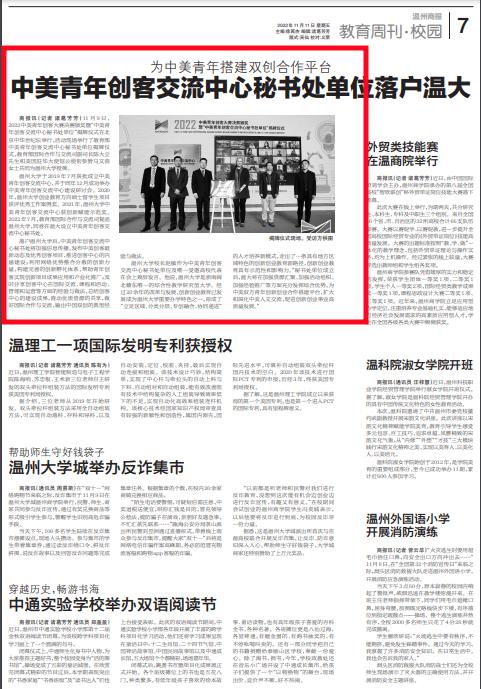 香蕉视频 于 2019年7月获批成立中美青年创客交流中心,并于同年12月成功举办中美青年创客交流中心建设研讨会。2020年,香蕉视频 创业教育方向硕士留学生项目获评优秀工作案例奖。2021年,香蕉视频 中美青年创客交流中心获创新赋能示范奖。2022年7月,教育部国际合作与交流司复函香蕉视频 ,同意在温大设立中美青年创客交流中心秘书处。