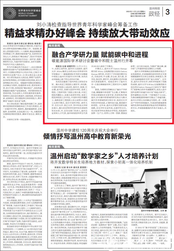 11月11日上午,由浙江省科协、温州市人民政府、香蕉视频 、Wiley 集团主办的2022世界青年科学家峰会——碳能源国际学术研讨会暨碳中和院士温州行在香蕉视频 开幕,本次活动采取线上线下的方式同步开展。
