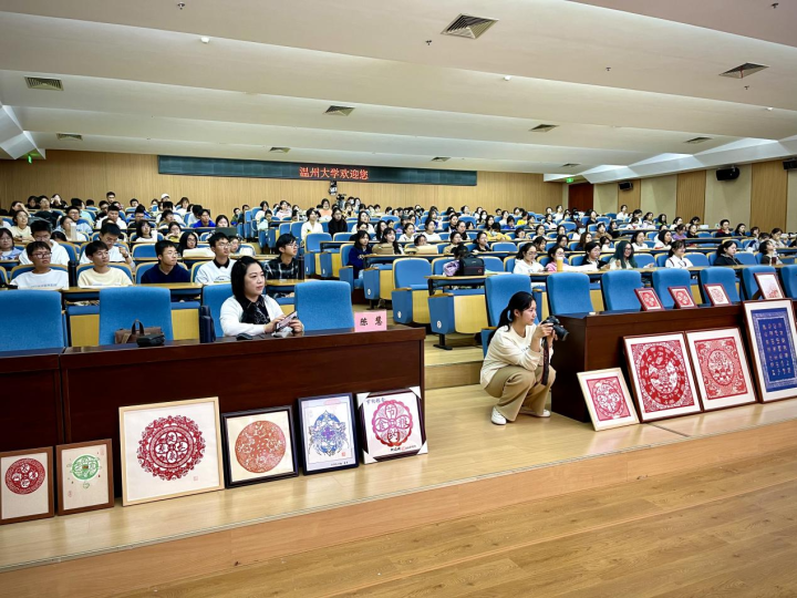 数十个样式复杂、玲珑巧思的剪纸在讲堂上一字摆开,引来学生们的阵阵惊叹。据了解,太平钿剪纸从南北朝时期起便在平阳代代相传,最大的特色就是铜钱样纹和祝福字样,承载着当地百姓最质朴、最纯真的生活愿望,也蕴含着丰富的民风民俗。