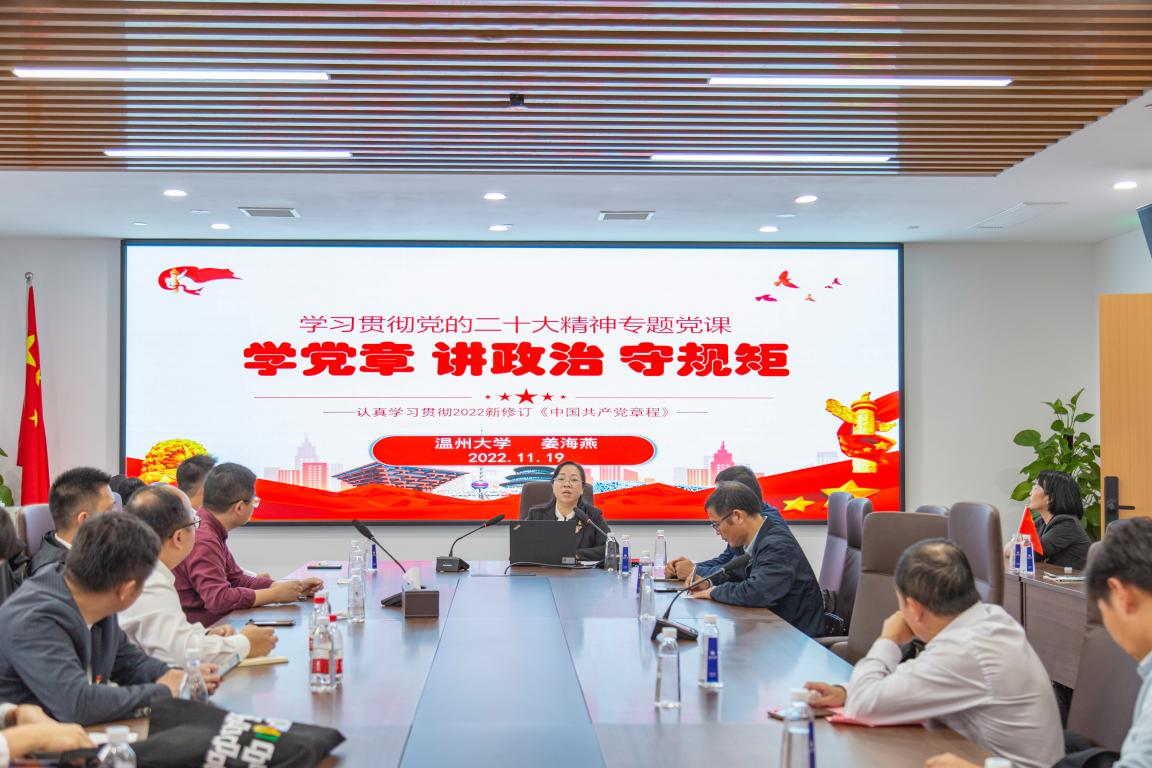 深入贯彻学习二十大精神,校企合作在理论与专业的深度融合中将学习落到实处。香蕉视频 生环教工党支部以习近平生态文明思想引领联盟建设,深入学习贯彻“推动绿色发展,促进人与自然和谐共生”的环保理念。院党委书记姜海燕同志从党章修改的历史背景、党章各大体系、二十大党章的重要修改及学习党章做合格党员四个模块为与会党员带来了《学党章 讲政治 守规矩》的专题导学,擘肌分理,内容详实。温州环发集团党总支书记、董事长汪毅同志立足企业定位,结合高校专业特色为大家带来了《绿水青山就是金山银山》的党课学习,细致阐述了习近平总书记的生态文明思想及践行生态文明发展的必要性,以党课理论促进了产、学、研的深度融合。