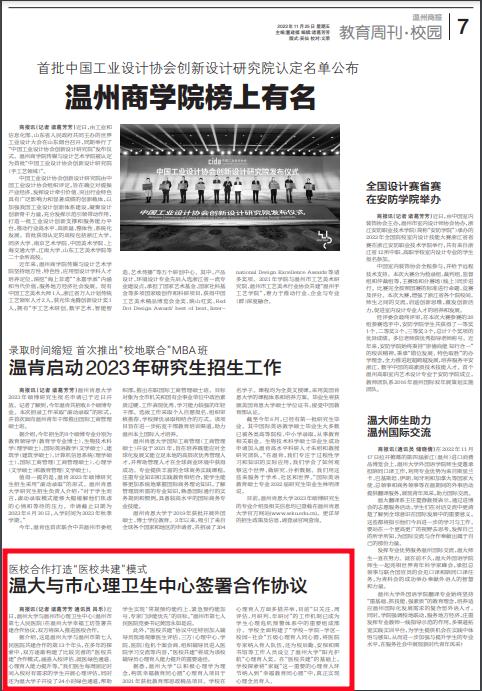 据介绍,这是香蕉视频 与温州市第七人 民医院共建合作的第13个年头,在多年的探 索中,双方逐渐构建了比较完善的“医校共 建”合作模式,涵盖入校评估、就医绿色通道、 心理育人能力提升等。“我们医生每周固定时 间入校对有需求的学生开展心理评估,同时 还为温大学子开设了24小时绿色通道,帮助 学生实现‘常规预约能约上、紧急预约能加 号、专家门诊能优先’的目标。”温州市第七人 民医院党委书记黄国永如是说。