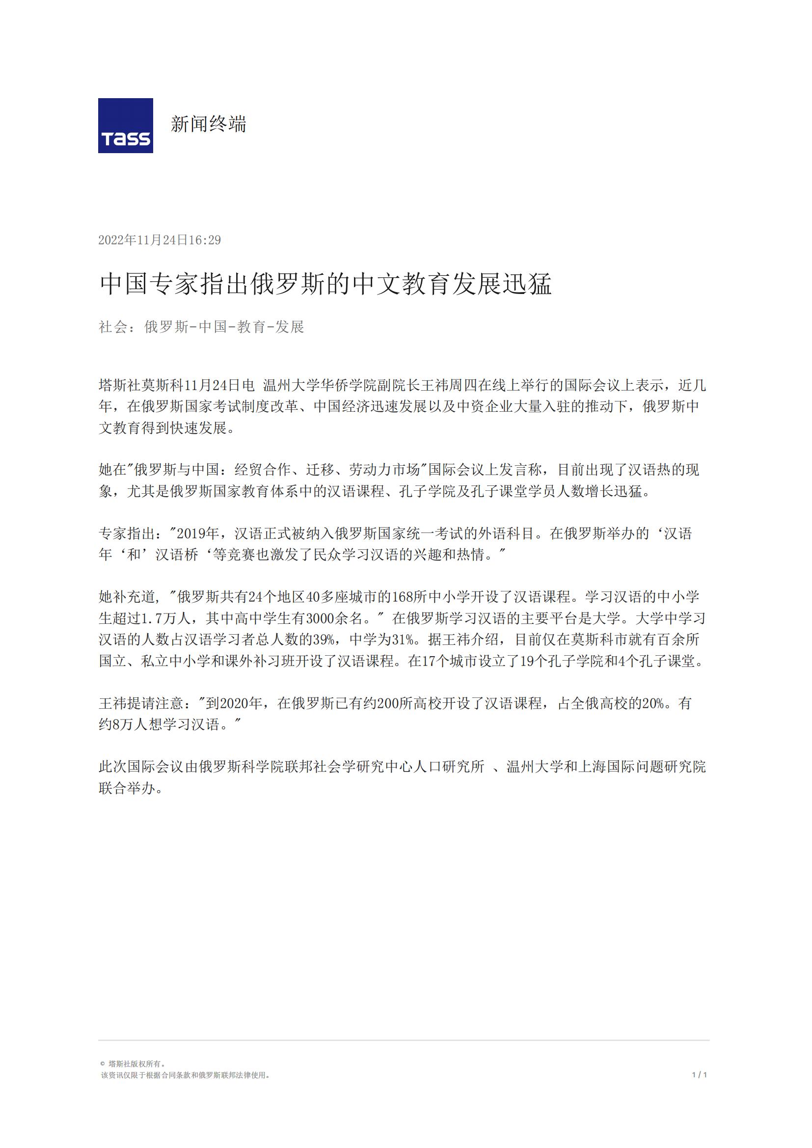 王祎提请注意:"到2020年,在俄罗斯已有约200所高校开设了汉语课程,占全俄高校的20%。有约8万人想学习汉语。"