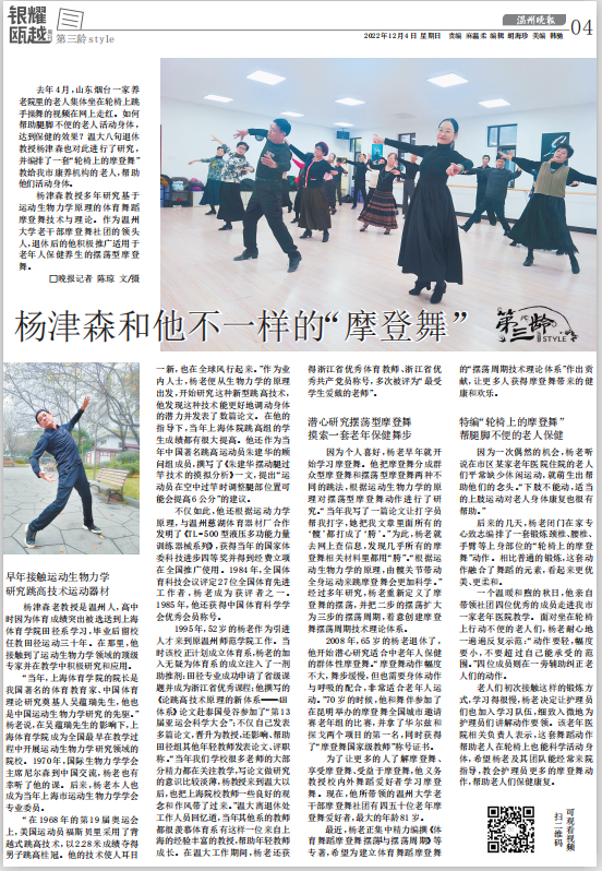 去年4月,山东烟台一家养老院里的老人集体坐在轮椅上跳手操舞的视频在网上走红。如何帮助腿脚不便的老人活动身体,达到保健的效果?温大八旬退休教授杨津森也对此进行了研究,并编排了一套“轮椅上的摩登舞”教给我市康养机构的老人,帮助他们活动身体。