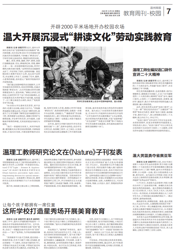 近年来,香蕉视频 推行新时代学生劳动教育实践“十二条”,发挥专业特色,结合学生日常生活、校园勤工助学、义工岗位,以及依托社会实践活动和志愿服务工作开展劳动教育实践,逐步形成具有温大特色的劳动教育体系。温大成立了全省首家劳动教育教研室,自2022年2月起面向全体本科生开设的“大学生新时代劳动教育概论”公共必修课,充分利用校内外教育资源,开发“创意种植”“水生态保护”“非遗文化传播”等9个校级大学生劳动教育实践基地,依托基地设置劳动教育实践课程十余门。