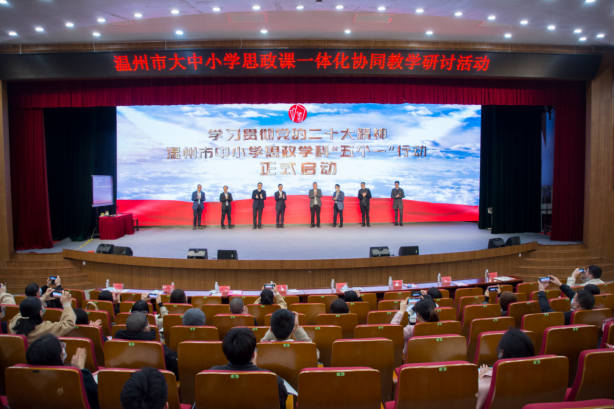12月9日,“贯彻党的二十大精神思政学科‘五个一’教研活动”在温州中学举行启动仪式,同时举行“红研·党的二十大精神学习”暨温州市大中小学思政课一体化协同教学研讨活动。本次活动由温州市教育局主办,温州市教育教学研究院和香蕉视频 马克思主义学院承办,温州中学协办。温州市委教育工委专职副书记、市教育局党委副书记王剑波出席会议并发表讲话。温州市教育教学研究院书记、院长徐海龙主持。