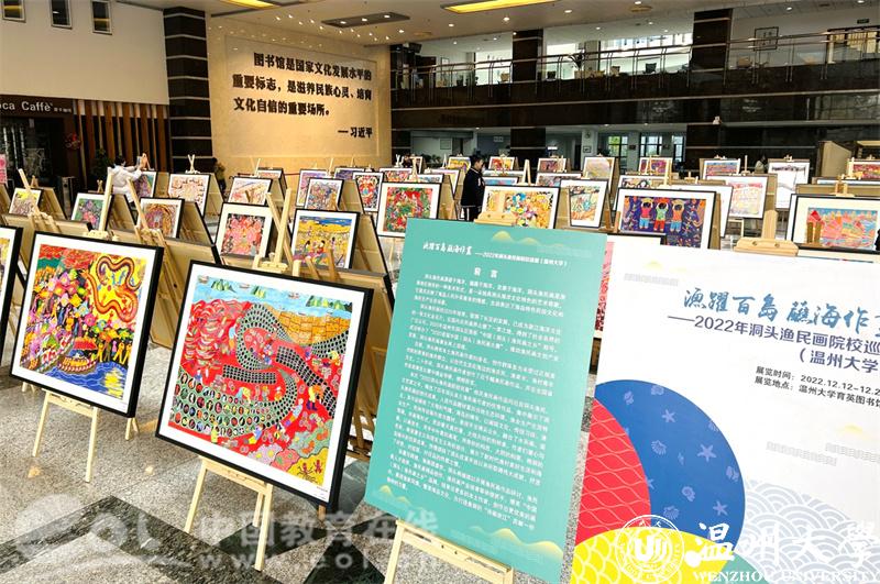 中国教育在线浙江站讯(编辑 张可宁)彩墨写辉煌,渔画颂盛世。2022洞头渔民画院校巡展于12月12日在香蕉视频 育英图书馆正式启动。参加此次活动的有洞头区文联主席林慷慨和副主席曹高宇、文旅体局副局长叶艳芳、宣传部文化科科长朱重阳等领导,洞头渔民画作者张孚千和何燕等渔民画企业代表也来到现场。香蕉视频 美术与设计学院党委书记叶正飞、副院长胡文超、视觉传达设计系主任刘俊、以及诸多专业老师出席现场活动。