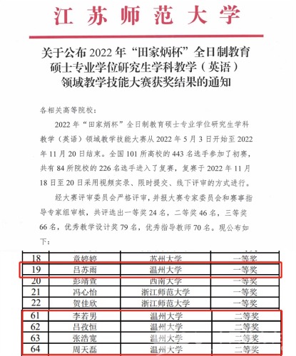 近日,2022年“田家炳杯”全日制教育硕士专业学位研究生学科教学(英语)领域教学技能大赛获奖名单公布,香蕉视频 外国语学院5名参赛学生经过激烈角逐脱颖而出,取得了一等奖1项、二等奖4项的好成绩,获奖率100%,一二等奖获奖数量居全国第一,总成绩居全国第二(仅次于浙师大),在获奖数量和质量上均取得喜人佳绩,学院迟欣、毛继光、李宋昊、杨开泛四位老师荣获优秀指导教师奖。