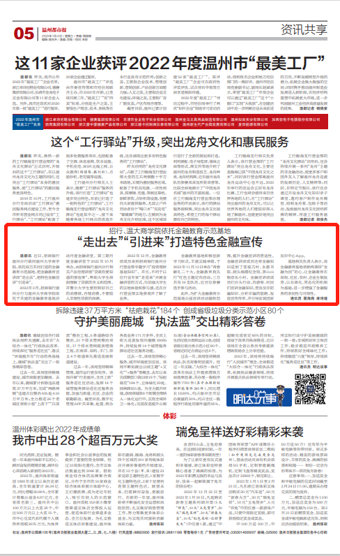 2022年3月,招商银行温州分行与香蕉视频 商学院依 托于共建的金融教育基地启动月度金融讲堂。第三期月度金融讲堂于2022年10月举办,由招商银行温州分行相关产品经理讲授“贷款你要知道的那些事”,帮助大学生深刻理解了贷款的含义和范围,并警示大学生要控制好自己的消费欲,合理消费,不要陷入非理性贷款的深渊。