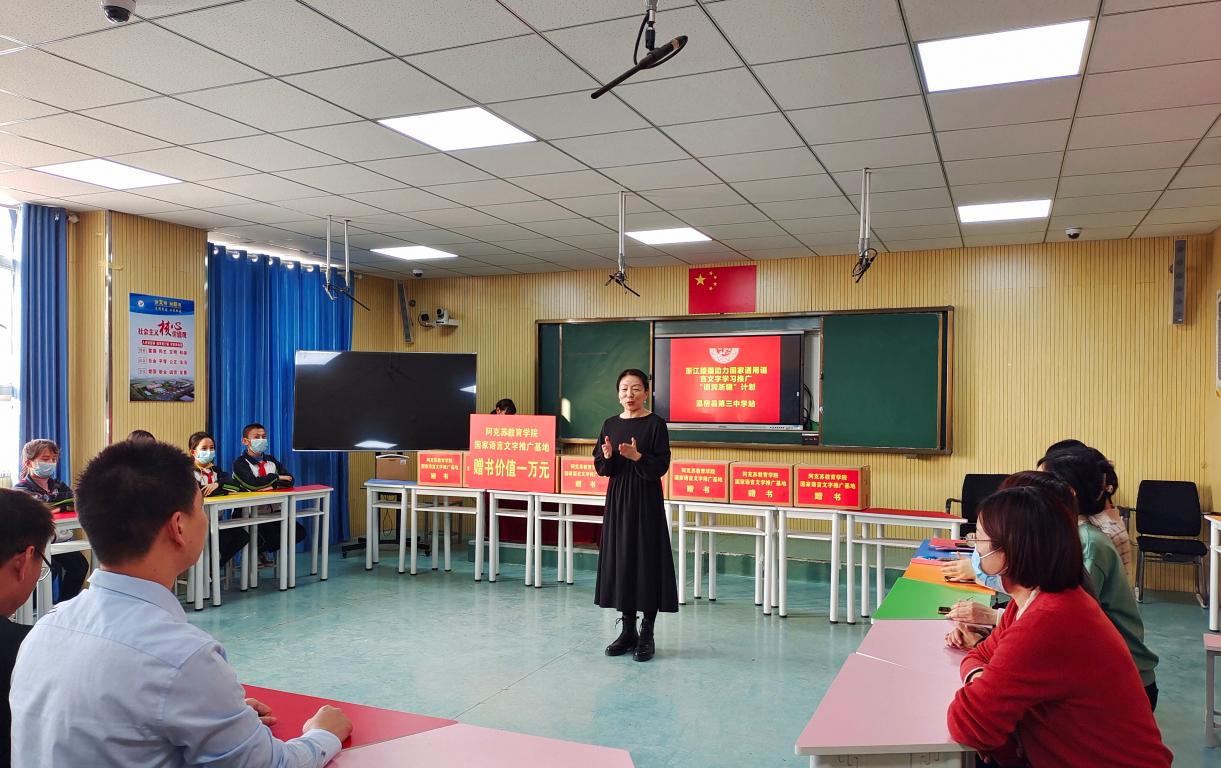 “垚垚俊峭天山,迢迢灵秀瓯江。凝心聚力倾情,推进语润浙疆。”近日,香蕉视频 教育学院援疆教师胡雯圆满结束了从浙到疆的“语润”之旅,满载而归。在学院举行的师德师风专题教育活动上,胡雯老师将她的“西行”故事娓娓道来。此番援疆,她“授人以渔”、育苗培才,也让国家通用语言文字走进城镇乡村,民族团结之花处处盛开。