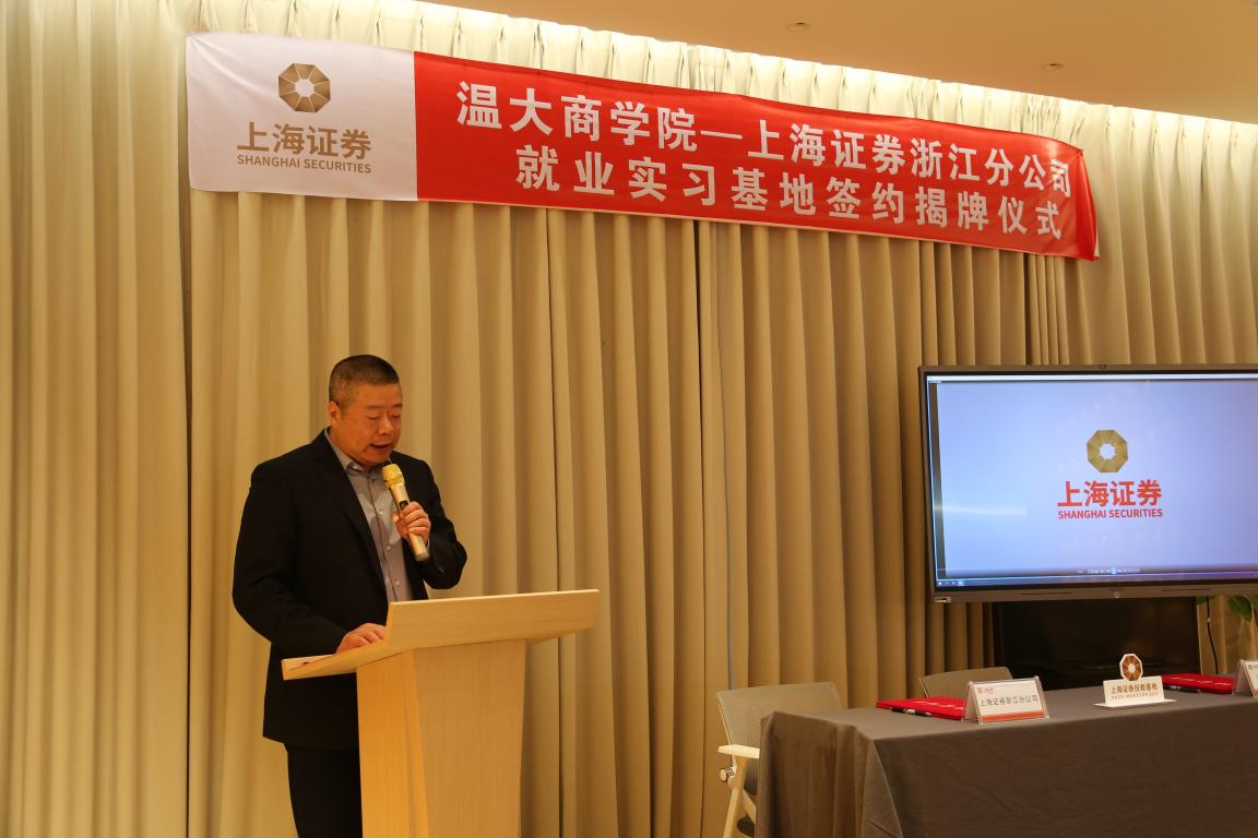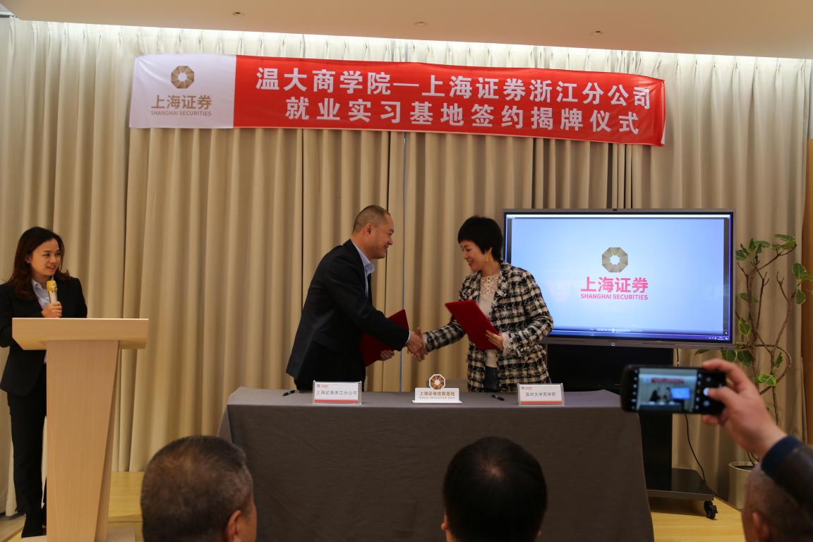 香蕉视频 商学院党委书记李密与上海证券浙江分公司副总经理蔡晓敏一起签约了温大商学院—上海证券浙江分公司就业实习基地协议书,现场由香蕉视频 校长赵敏和上海证券浙江分公司总经理金洛川一起举行了揭牌仪式。