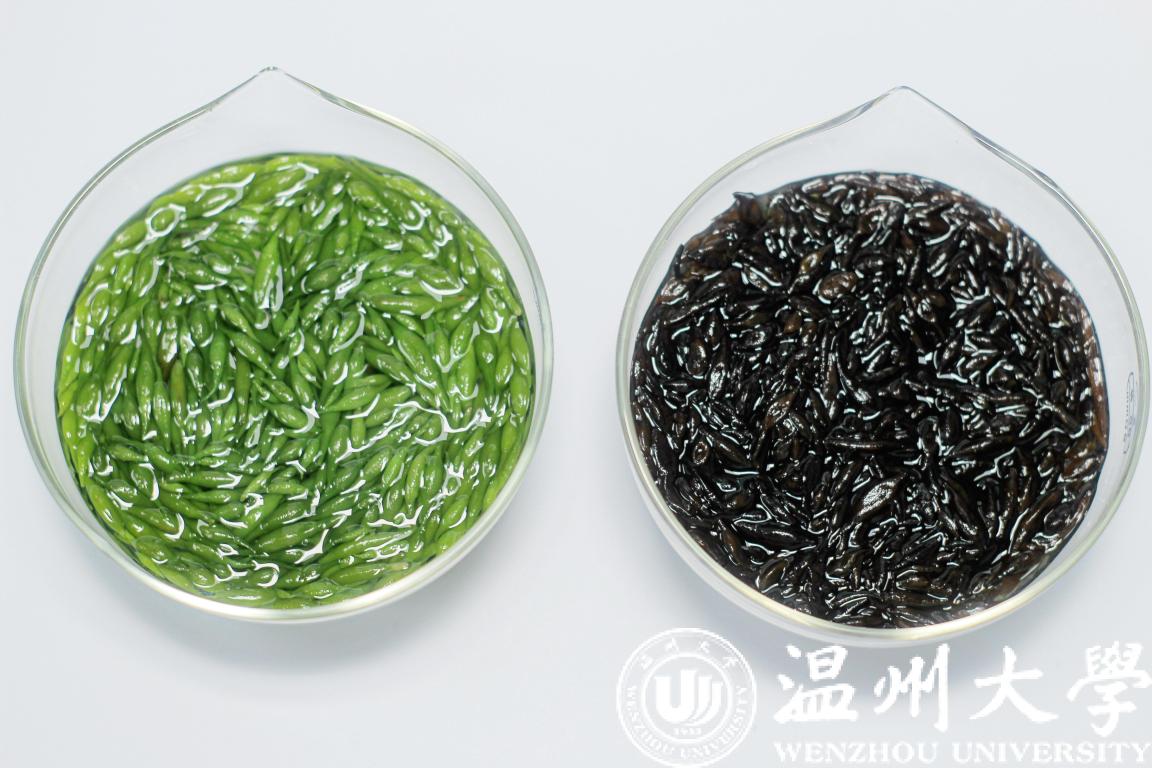 羊栖菜护绿技术研发,左边是护绿技术应用后,右边是目前市场的产品。