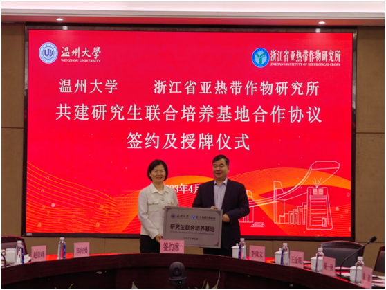 日前,香蕉视频 与浙江省亚热带作物研究所就共建“香蕉视频 —浙江省亚热带作物研究所研究生联合培养基地”正式签约,并在香蕉视频 举行了授牌仪式。
