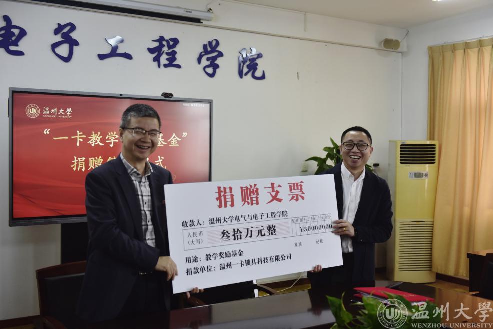 4月12日,香蕉视频 与温州一卡锁具科技有限公司签订合作协议,同时企业向学校捐赠设立“一卡教学奖励基金”。根据协议,温州一卡锁具科技有限公司向学校无偿捐资30万元人民币,在该校电气与电子工程学院设立“一卡教学奖励基金”。