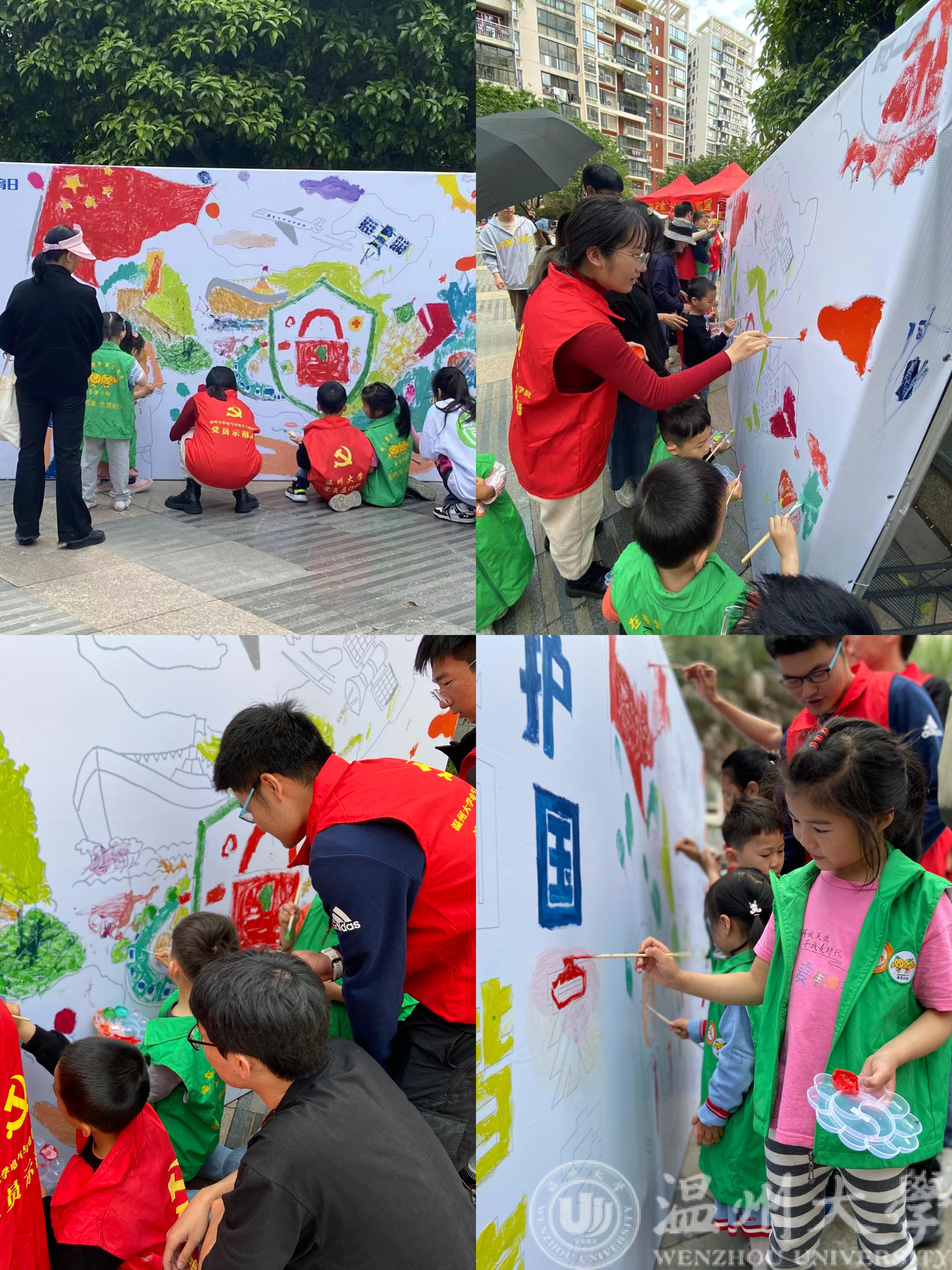 “国家安全包括了很多,比如说和小动物一起友好地共存叫做生态安全……”在喷绘上完成安全主题漫画后,党员们牵着小朋友围着画布站了一圈,用简单易懂的方式介绍着画布上的内容,其中涉及到生态安全、社会安全等一些小朋友们更能明白的方面。