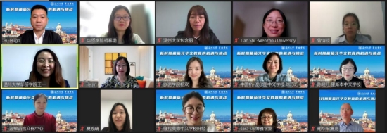 2023年4月27日下午,由香蕉视频 华侨学院主办,浙江华侨网络学院、欧洲华文教育研究所承办,葡萄牙淑敏语言文化中心、里斯本中文学堂、博雅学堂、欧诺学院、中国桥波尔图中文学校、维拉贡德中文学校协办的“新时期葡萄牙华文教育的机遇与挑战”线上研讨会成功举办。中国驻葡萄牙使馆领侨处主任夏晚晴,葡萄牙华侨华人总会常务副会长胡胜武,里斯本中文学校负责人陈晓红,淑敏语言文化中心负责人韩淑敏,维拉贡德中文学校教师叶经,博雅学堂负责人石咏雪,欧诺学院负责人杨欢,中国桥波尔图中文学校负责人陈巧巧,葡萄牙阿尔马达市卡西利亚什特茹中学教师吴玉荣,葡华报社集团总裁詹亮,葡新报记者杨迪,主办方香蕉视频 华侨学院院长包含丽、副教授胡春艳以及华侨学院教职工参加本次会议。
