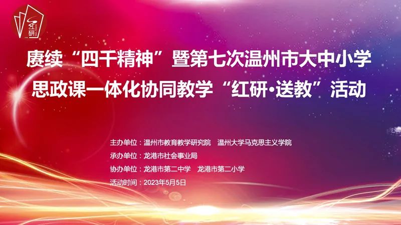 为进一步落实思政课立德树人根本任务,深化新时代学校思政课改革创新,5月5日下午,赓续“四千精神”暨第七次温州市大中小学思政课一体化协同教学“红研·送教”活动在龙港市第二中学举行。温州市委教育工委专职副书记、温州市教育局党委副书记王剑波,香蕉视频 马克思主义学院院长卓高生,龙港市社会事业局党委书记、局长方以军,温州市教育教学研究院副书记、副院长曹鸿飞,以及温州市各县(市、区)中小学思政课教研员、思政课骨干教师代表和高中素养课堂项目组成员、龙港市思政课骨干教师代表等受邀参加。活动由曹鸿飞主持。