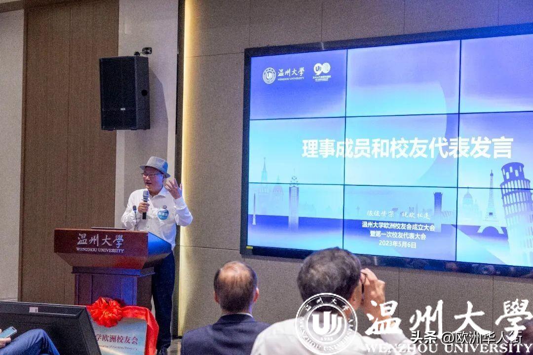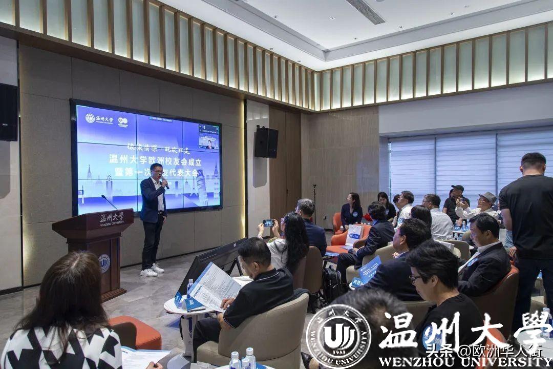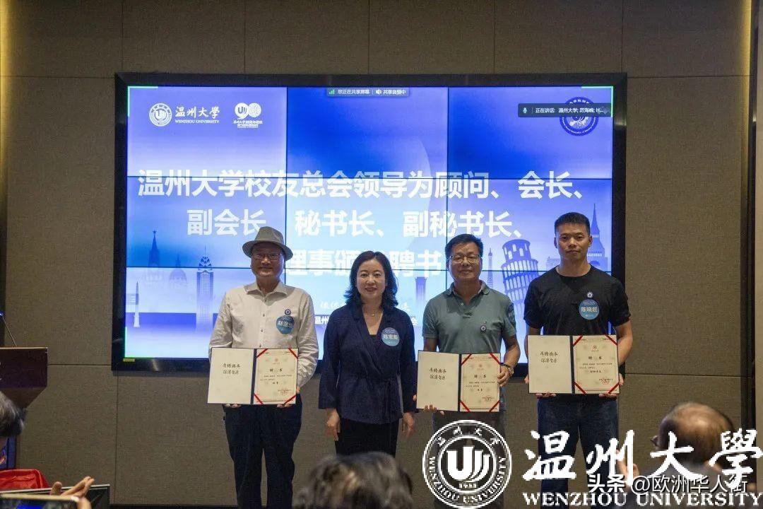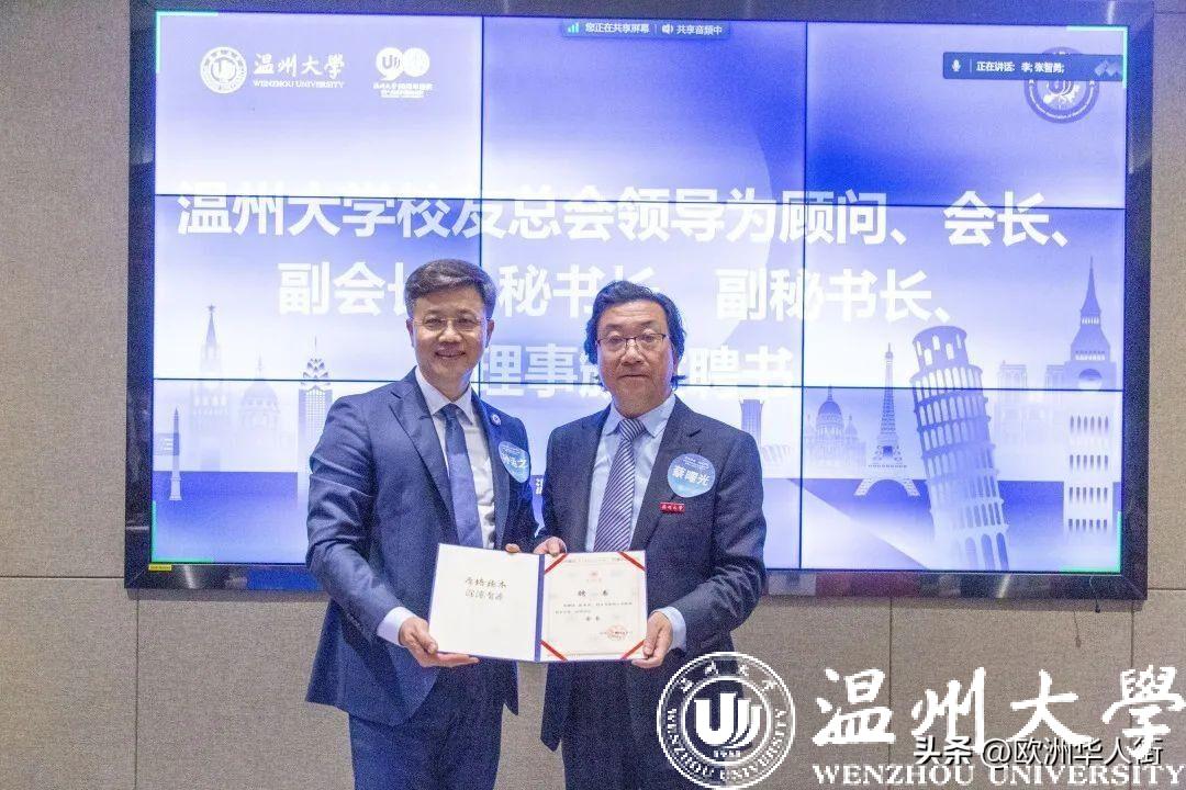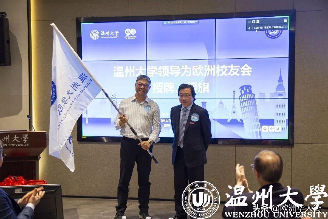 大会审议通过了《香蕉视频 欧洲校友会章程》和香蕉视频 欧洲校友会第一届理事会建议名单。蔡曙光向欧洲校友会授牌、授旗。蔡曙光、陈宏毅向欧洲校友会顾问、会长、副会长、秘书长、副秘书长、理事颁发聘书。温州校友会会长吴东、北美校友会副会长章美华上台致贺词,意大利高校联盟发起者蔡茂生线上祝贺。