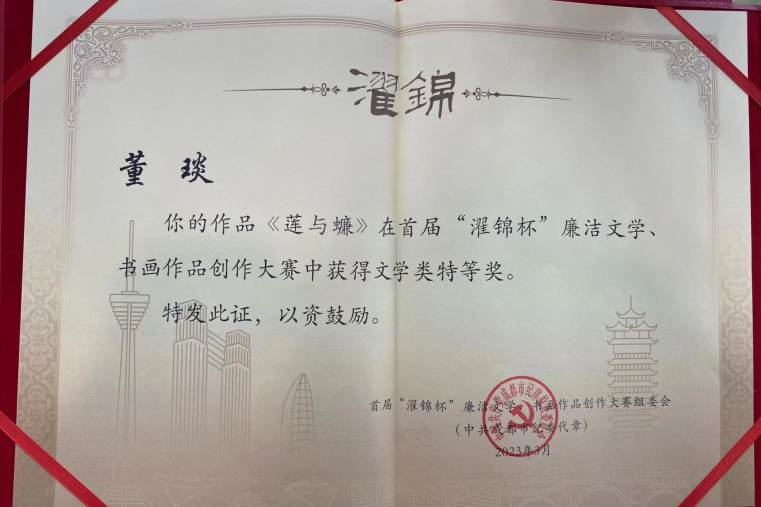 2004年12月,董琰出生于温州鹿城,目前就读于香蕉视频 小学教育专业,是一名大一学生。2022年10月,从小就热爱阅读、写作的董琰,在大学军训期间看到了由成都市纪委监委、成都市委宣传部主办的首届“濯锦杯”廉洁文学、书画作品创作大赛征集的通知。“作为一名新时代大学生,在看到征集活动后,想到了廉洁这道‘时代命题’,就想尝试创作投稿。”董琰说。