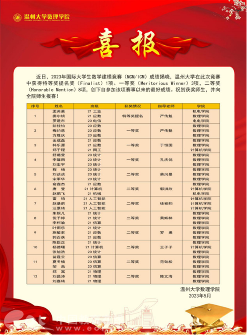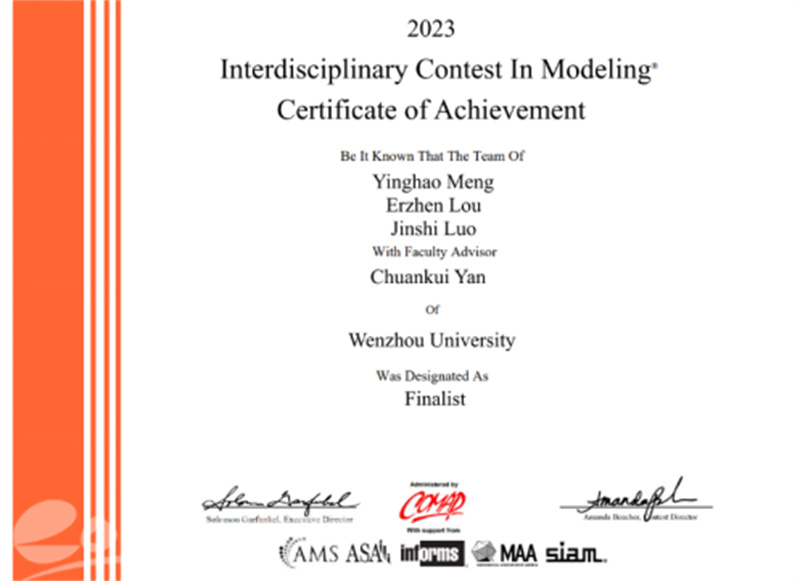 近日,记者从温州“数学家之乡”人才培养研究中心(香蕉视频 数理学院)(以下简称研究中心)获悉,2023年国际大学生数学建模竞赛(MCM/ICM)成绩已揭晓,香蕉视频 在此次竞赛中获得特等奖提名奖(Finalist)1项、一等奖(Meritorious Winner)3项,二等奖(Honorable Mention)8项,创下自参加该项赛事以来的最好成绩。