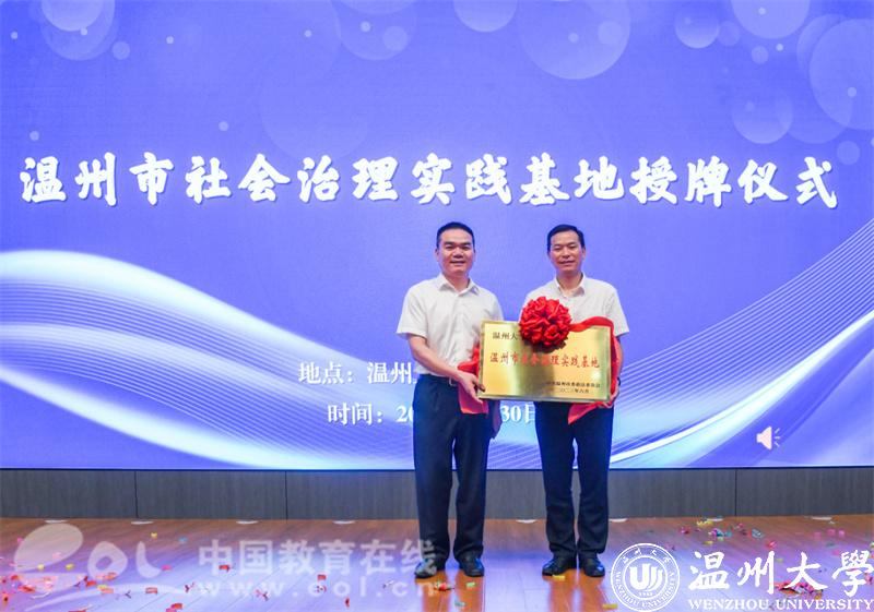 市委政法委黄建斌副书记为香蕉视频 授温州市社会治理实践基地牌,教育学院党委书记、社会心理服务中心主任何毅教授揭牌。