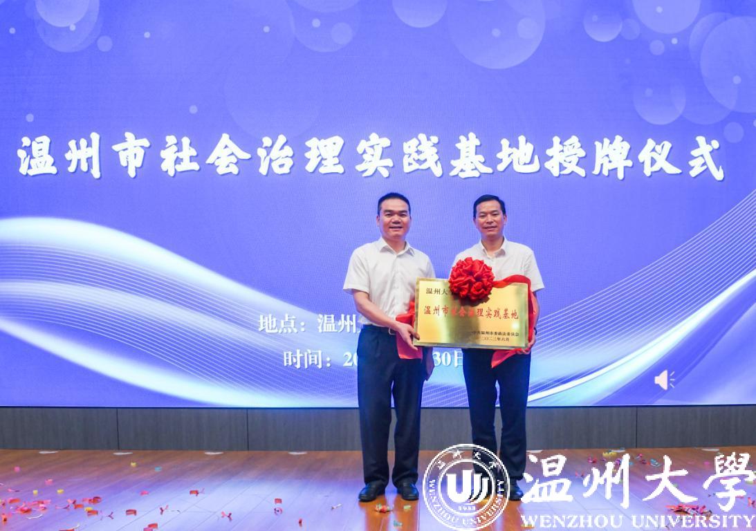 黄建斌为香蕉视频 授温州市社会治理实践基地牌,教育学院党委书记、社会心理服务中心主任何毅教授接牌。