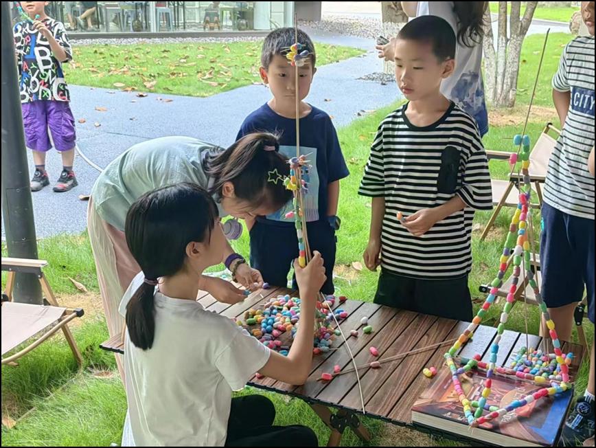 活动中,小朋友们充分发挥想象,搭建出的建筑形状各异,彩色的泡沫球点缀着整个榕亭书屋,实践队员和孩子们齐聚榕树下,欢声笑语充斥着整个校园。