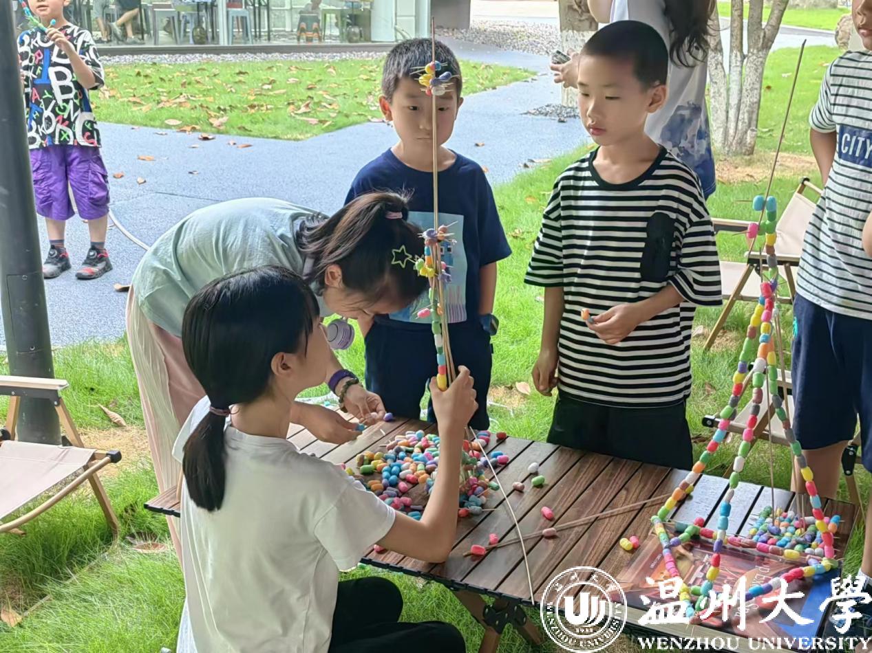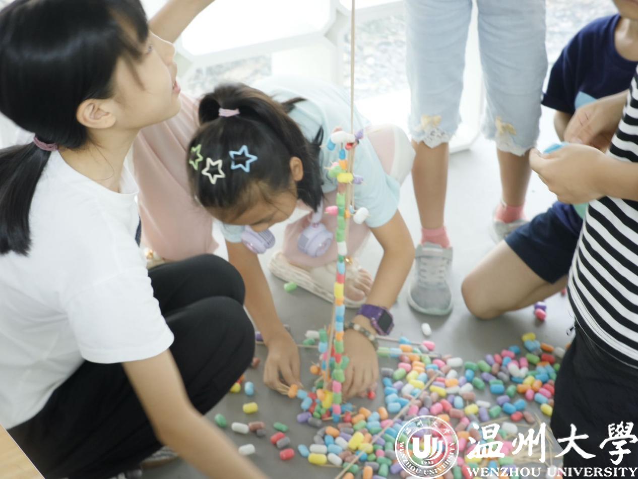 在香蕉视频 榕亭书屋,香蕉视频 暑期实践队和小朋友们一起开展了一堂“温大第一高楼”建设大比拼。活动利用牙签、木棍与彩色泡沫球搭接,进行“建设大比拼”,对比各组的搭建高度。