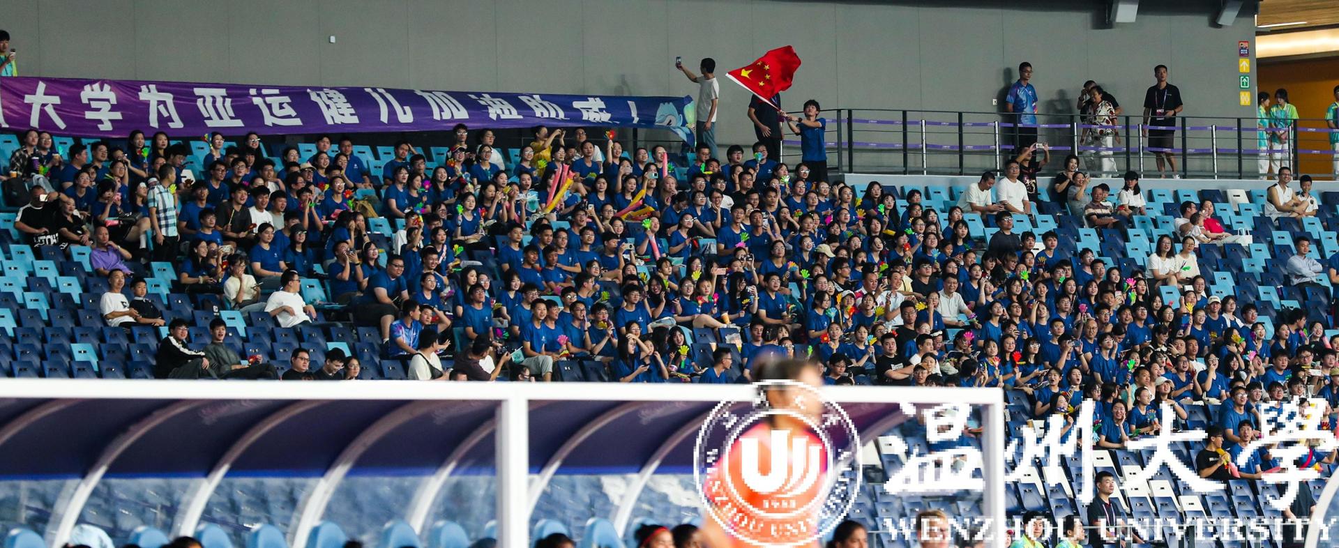 一身蓝衣,青春靓丽。由300多名香蕉视频 师生组成的观赛团,无疑是当晚观众席里最亮眼的一道风景。据领队老师周佳莼介绍,为了组织学生观看本场赛事,香蕉视频 在9月初便在全校范围发起了观赛邀约,很快便有将近600多名师生主动报名。“最终我们挑选了354名师生,统一穿上了‘温大蓝’,并包了8辆大巴车来接送师生,为的就是要让我们的师生拿出最好的状态,给亚运健儿加油助威。”