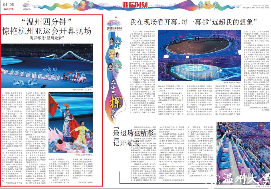 昨晚,杭州第 19 届亚 运会正式开幕,由温州人 创、温州人导、温州人演 的大型原创文艺节目 《千 年商港 幸福温州》 亮相亚 运开幕现场,节目中处处 展现的“温州元素”惊艳 了万千观众。