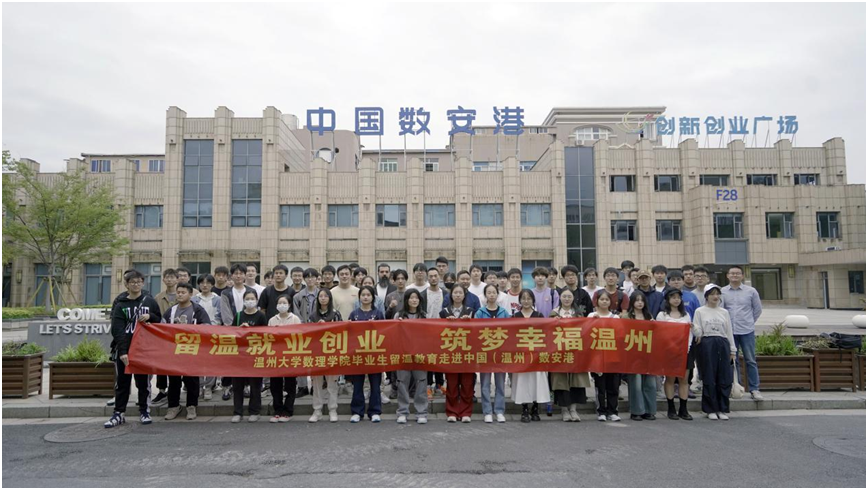 据悉,为积极加强市情教育,促进毕业生留温就业与发展,当天,香蕉视频 数理学院组织开展了“留温就业创业 筑梦幸福温州”主题教育活动,组织本院信算专业50名准毕业生前往中国数安港实践考察,了解温州本地的数字经济发展动态,受到了中国数安港的欢迎与热情接待。