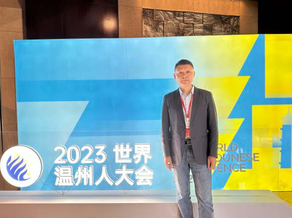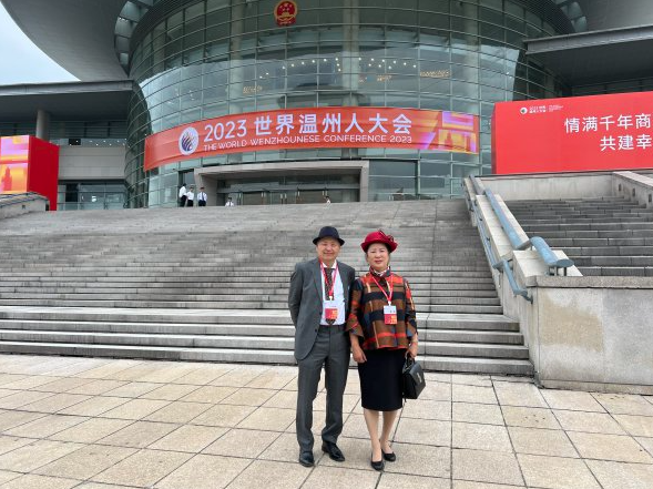 照片里,叶胜强夫妇身着正装、并肩而站,身后大会堂前挂着横幅“2023世界温州人大会”。看着这张照片,池飞很是感慨,拿出了手机里保存着的一张20年前夫妇俩来参会的合照——同一场大会,同一个地方,不同的是20年前的那张照片里还有他们的大女儿。池飞说,那一年,大女儿在荷兰来顿大学读书,作为交换生到北京清华大学学习一年。夫妻俩受邀回温,就带上大女儿一起回来,在会场外留下了一张珍贵的合影。