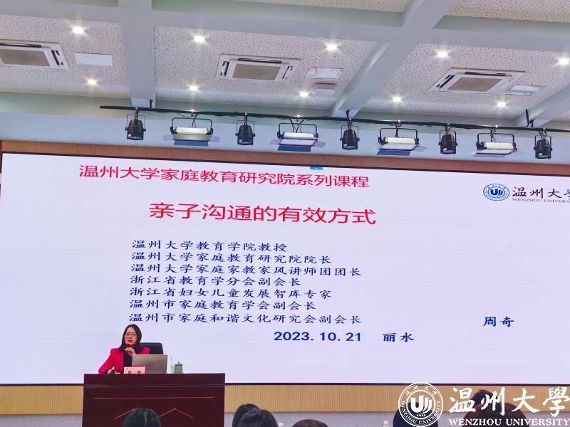 2023年10月21日下午,香蕉视频 教育学院教育学系党支部书记、香蕉视频 家庭教育研究院巾帼文明岗负责人、浙江省教育学分会副会长、浙江省妇女儿童发展智库专家、温州市家庭教育学会副会长、温州市家庭和谐文化研究会副会长周奇教授受邀来到丽水开放大学6号楼2楼教室为参加丽水市家庭教育指导者能力提升培训班的家庭教育骨干教师做《亲子沟通的有效方式》的家庭教育专题分享。