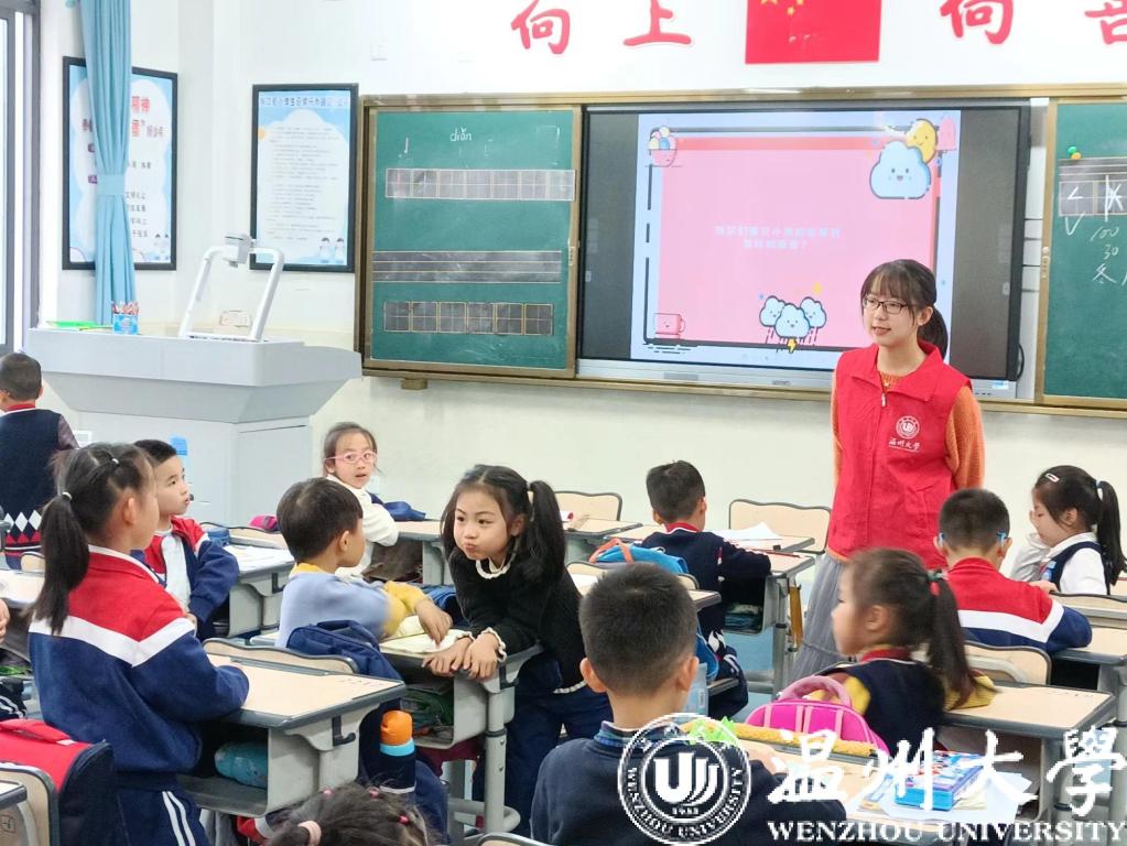 “哎呦呦,快拔掉,疼得小熊双脚跳。”从大一开始,陈怡佳便经常去小学、社区进行儿童绘本教育。陈怡佳成长于乐清的一个小村,她说:“小时候,我认识了一位知心姐姐,她与我写信、打电话,给我讲述远方的故事,陪伴我成长。从那时起,我就决定长大以后也要成为这样一位帮助小朋友的人。进入大学后,我加入学校志愿服务队,常常去小学、社区,带小朋友读绘本、演绘本。在我看来,这是与小朋友交流的很好途径,我可以将一些生活常识、道理融入其中,在趣味中传播给小朋友,成为他们童年的‘知心姐姐’。”