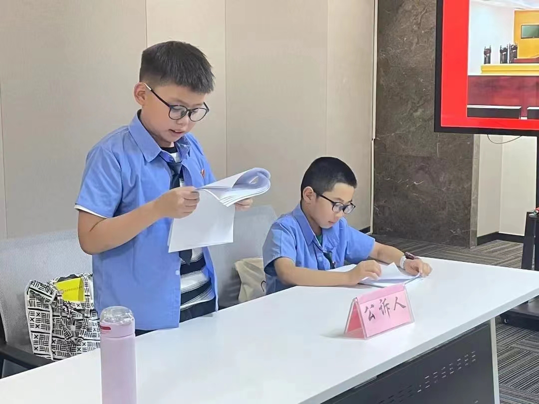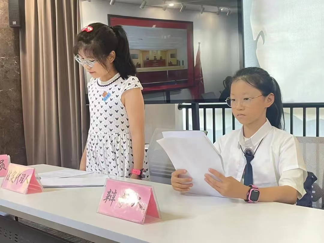 “砰——”扮演“审判长”的营员穿着法官袍,敲响法槌,正在活动室里朗声宣布“开庭!”