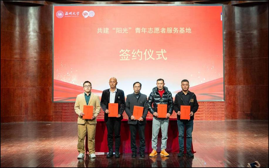会上,“阳光”志愿服务团队指导师、浙江省“双带头人”教师党支部书记何明昌教授,代表香蕉视频 数理学院与瓯海茶山街道山根社区、丽岙侨心养老院、康居乐养老院、温州福寿康公司签署共建“阳光”青年志愿者服务基地协议书。数理学院副院长蔡风景为上述四家服务单位授牌。章志图为数学、物理、统计、信算等四个专业的“阳光”志愿者分队授旗。师生通过敲鼓的形式共同启动“阳光”敬老服务月活动。