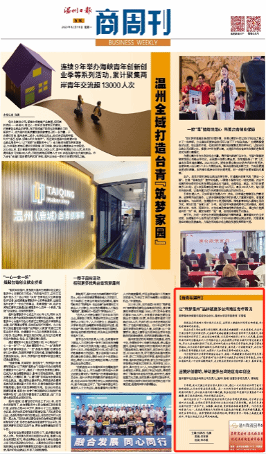 作为筑梦温州台湾青年联谊会总会长,我每一年都邀请台湾地区学生及博士友人来温参观交流,让“筑梦温州”这个品牌可以被更多台湾地区青年看见,让他们知道温州是一个美丽温暖的城市,是台胞在这里就业创业的第二故乡、崭新家园。