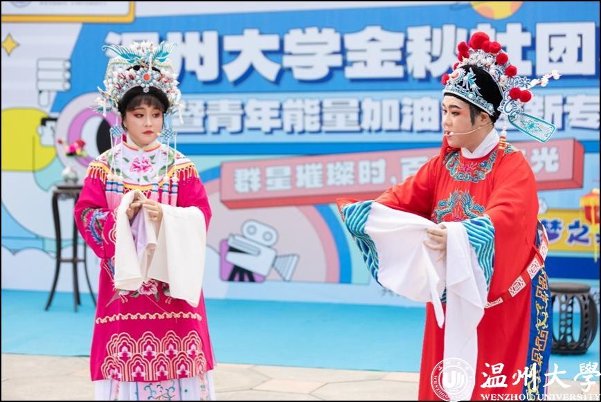 舞台区内,吉他协会、国标舞社等10余个学生社团带来的节目为现场的同学传递着青春的活力与能量,而由香蕉视频 红楼戏曲社、朗诵协会等学生社团带来的《打金枝》《红色的括苍山》等节目,则是让同学们沉浸式感受到中华优秀传统文化魅力及浙南浓厚的红色文化基因。